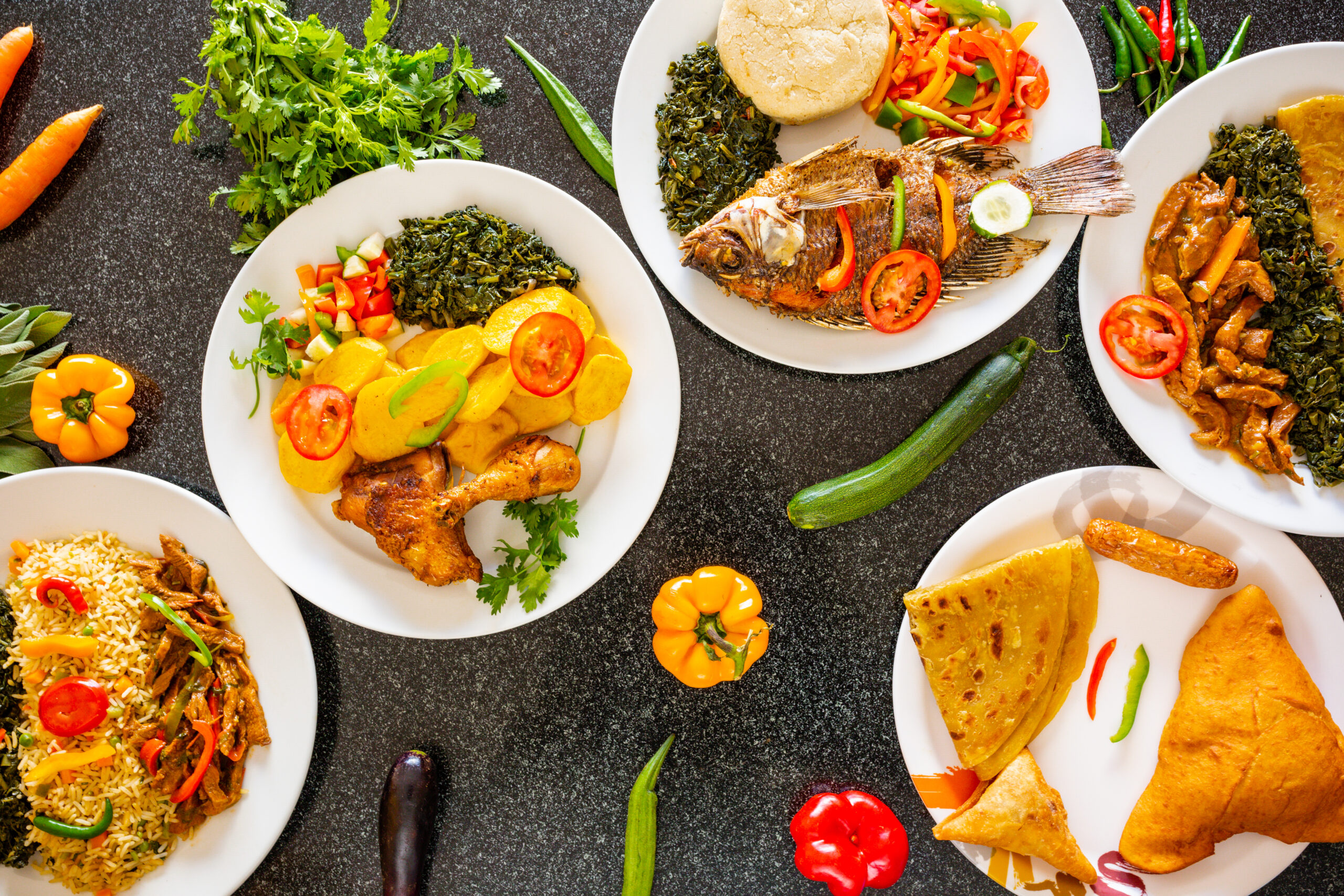 Assorted diaspora food dishes including rice, vegetables, fish and flatbread representing global cuisines in the UK